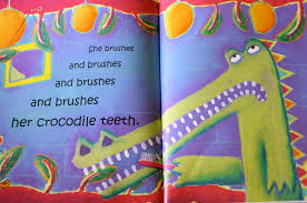 We had so much fun finger painting this week! After reading the book, Clarabella's Teeth we made big crocodile-sized toothbrushes! First we finger-painted the handle, then we cut the bristles. Poor Clarabella will now be able to brush all of her teeth at the same time.